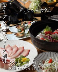 季節の一品料理・宇和島ぶりしゃぶなど全11品が楽しめるコースを、2月28日まで1,000円オフでご提供いたします!宇和島ぶりの旨味をぜひこの機会にご堪能ください。