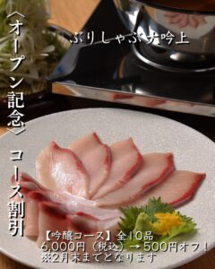 錦糸町の居酒屋「ぶりしゃぶ 大吟上」では、新鮮なぶりを使用したぶりしゃぶを提供。プリッとした歯ごたえとしっとりとした脂が自慢です。宴会や飲み会、記念日にも最適なコースをご用意しております。